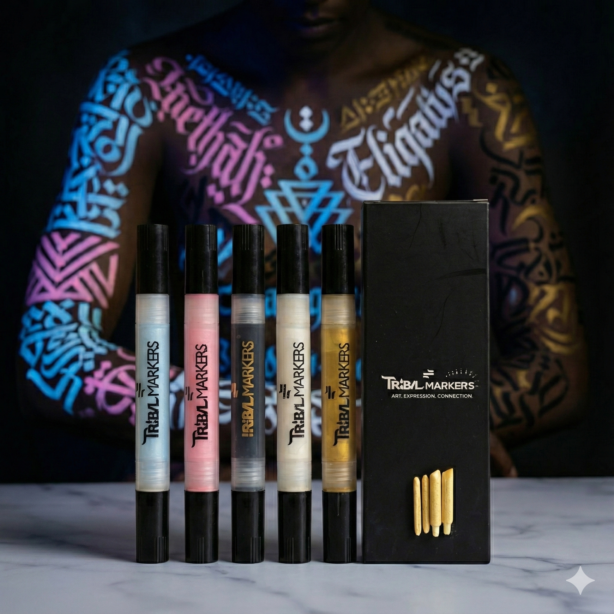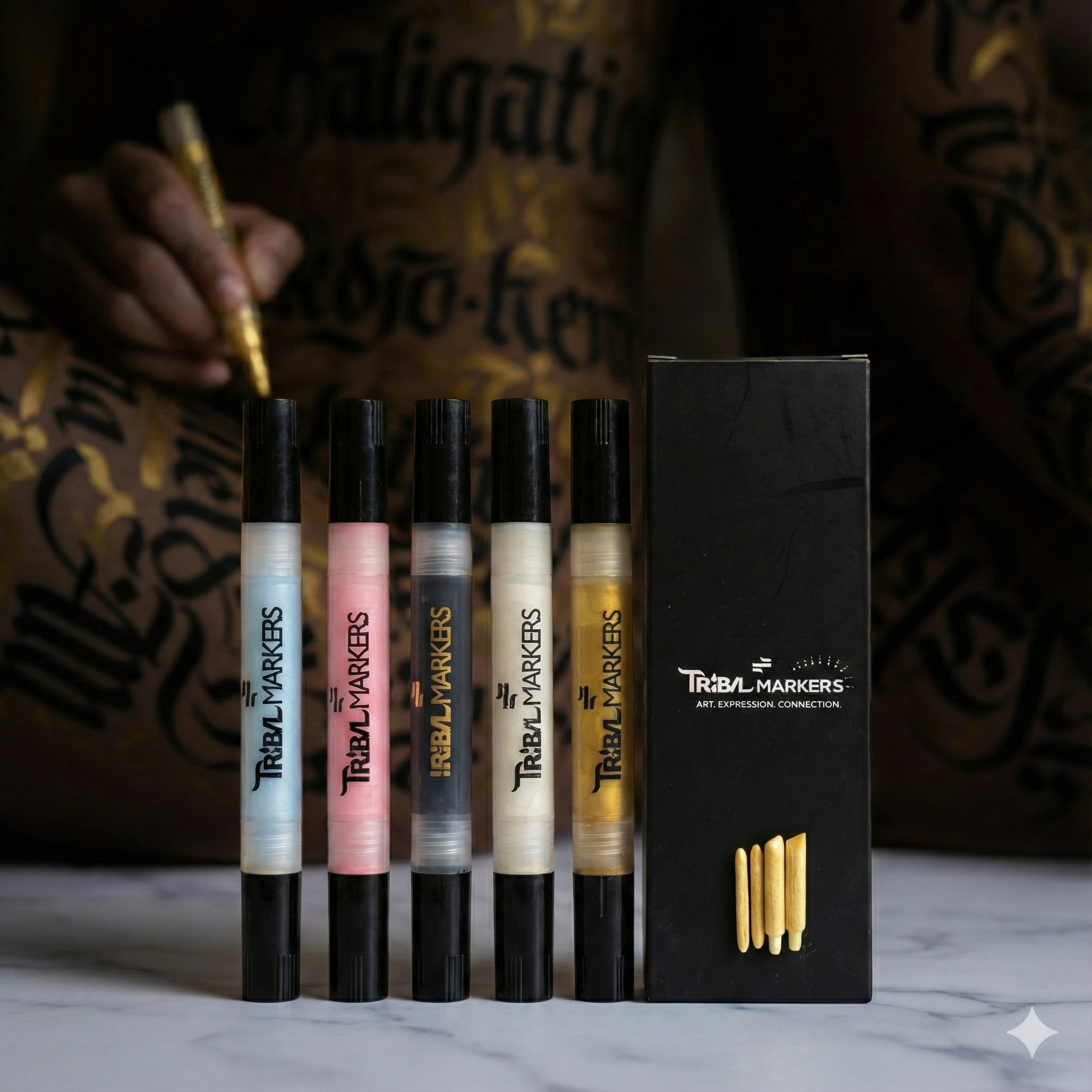 Featuring a dual tip - bullet and chisel/calligraphy tips for versatile expression dots lines and thin to thick strokes for the body and ceremonial design.